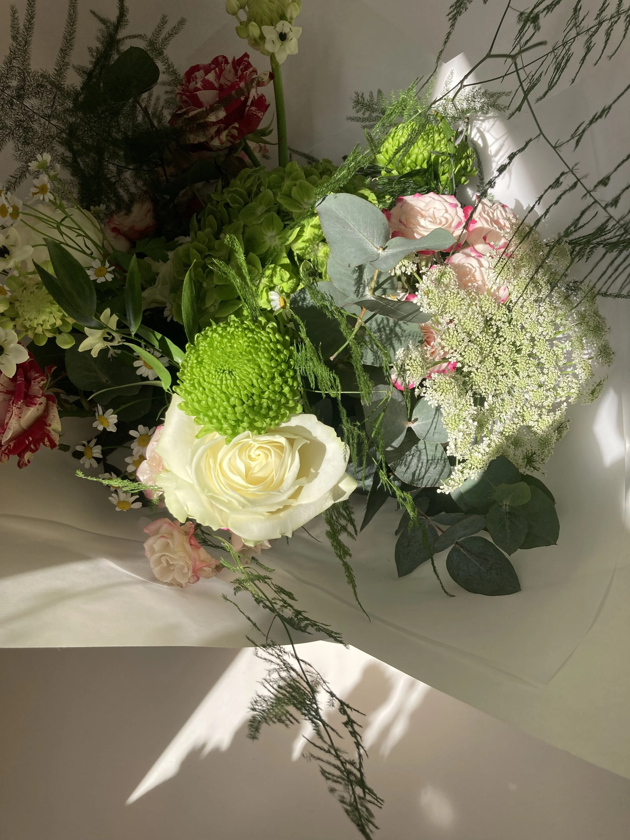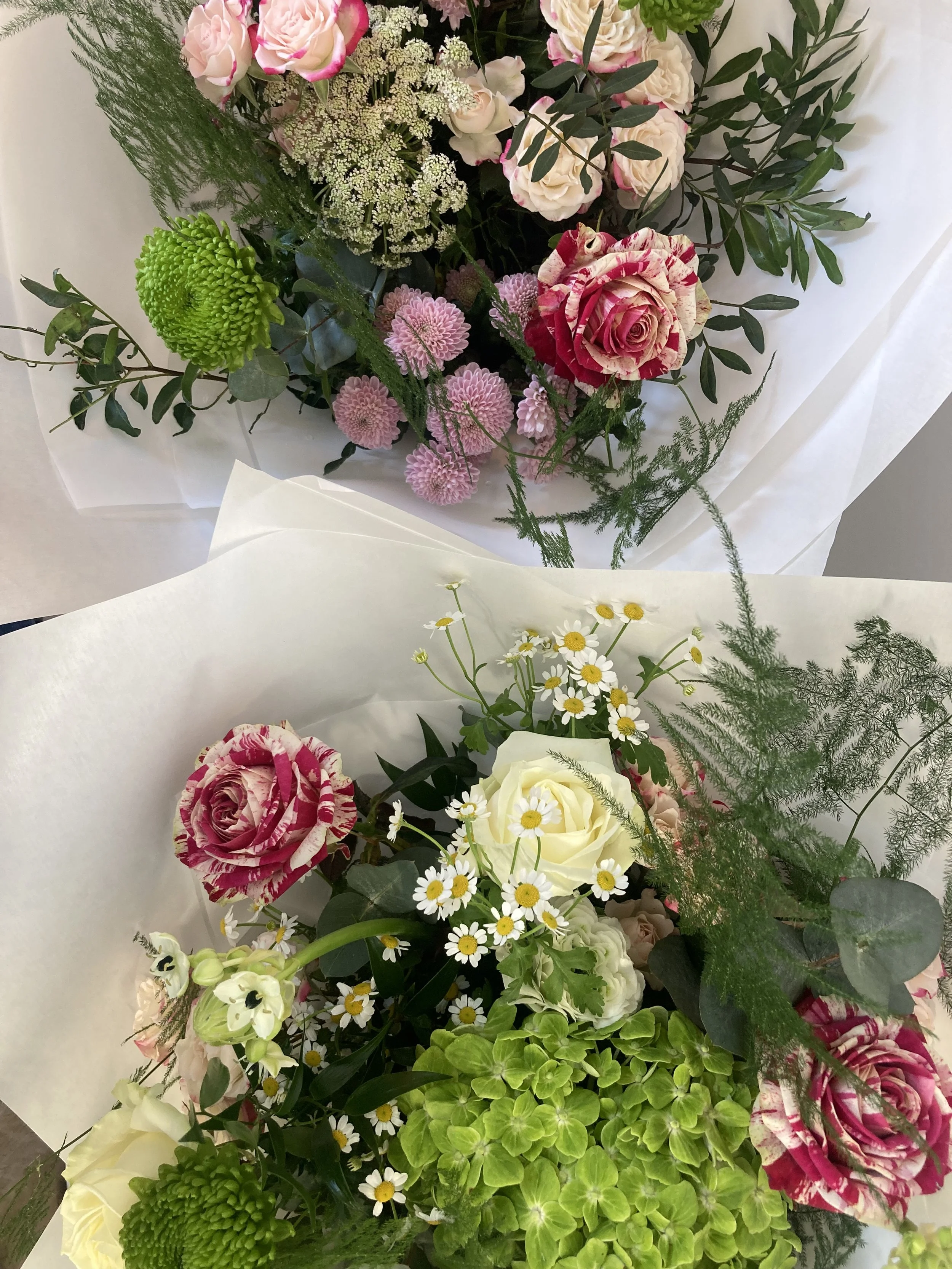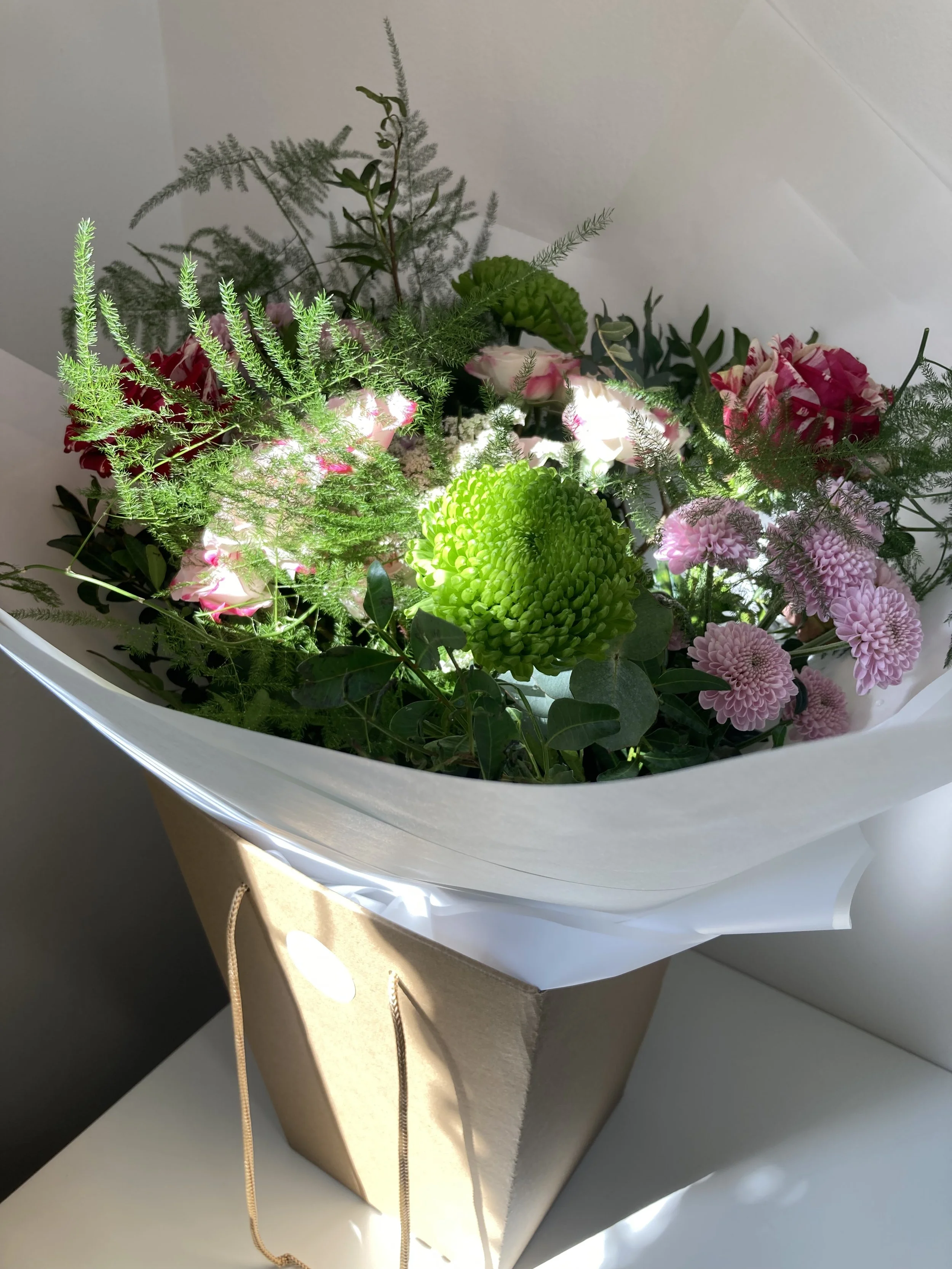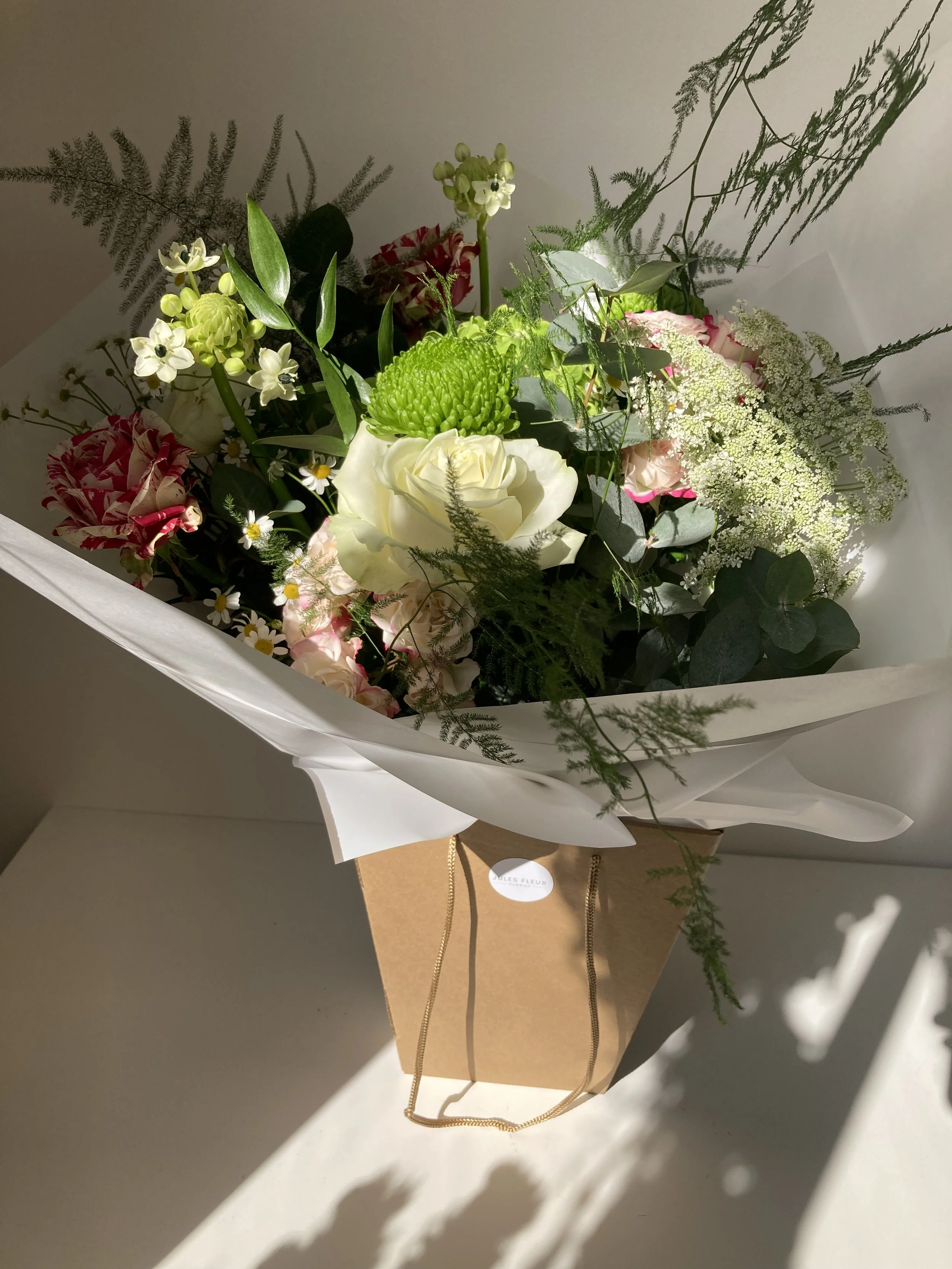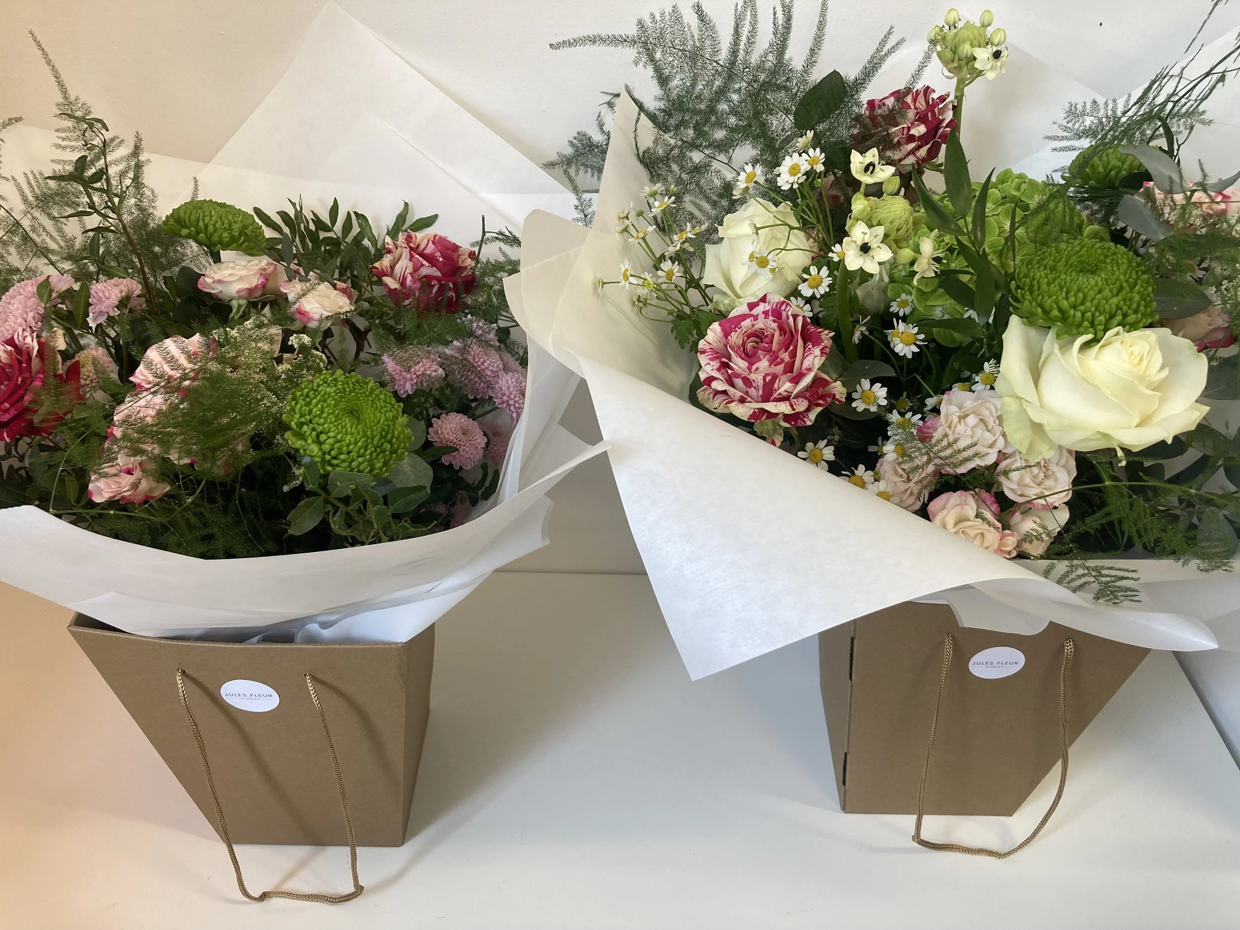 Fresh flower, hand tied bouquets, wrapped in white paper, in a water source in a stylish box.